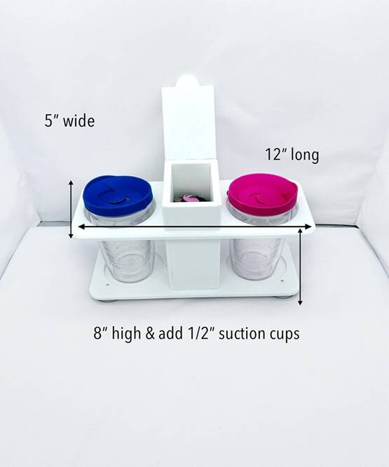 Wall attached (2) Cup holder, cell phone holder, with a catch all tray, constructed out 1/2 Marine King Starboard. Attention to detail includes drains holes in cup holders, catch tray, and cell phone holder, rounded over edges for a smooth finish, dado joinery, and stainless screws.